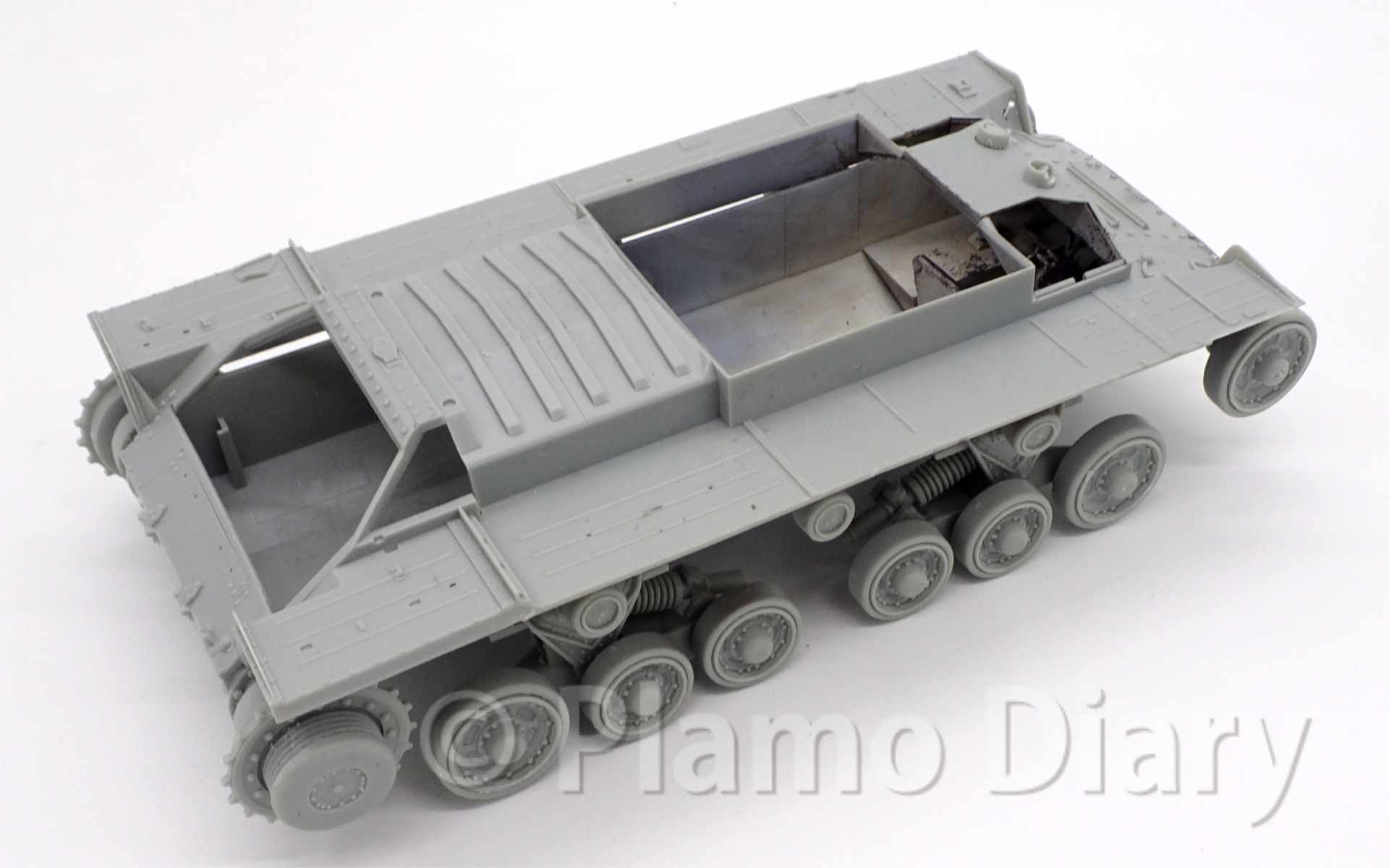 運転席を仕上げて車体上部を接着します。小型の車体のため無線手席は無く、無線機は砲塔内車長席にあります。車体前部は1人乗りにもかかわらず、左右に大きなハッチがあり、中が良く見えます。キットでは運転席が簡単に再現されているので、これを先に作ります。そして車体上部を接着します。
