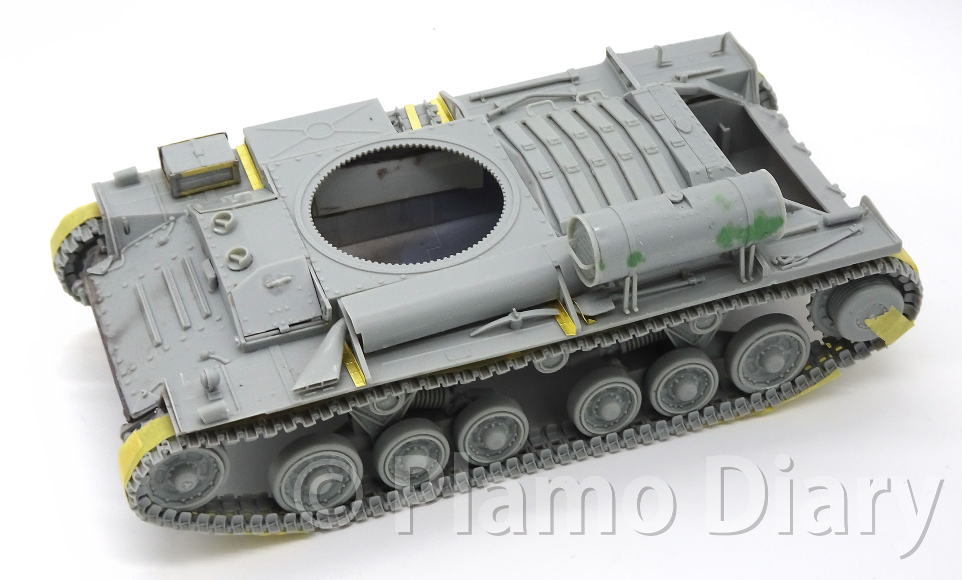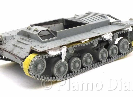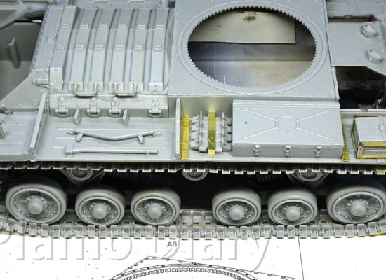 前回に続いて、今回は車体の左側を組み立てます。左側にはスコップなどのOVMだけでなく、大きな排気管と予備の燃料タンクがあります。