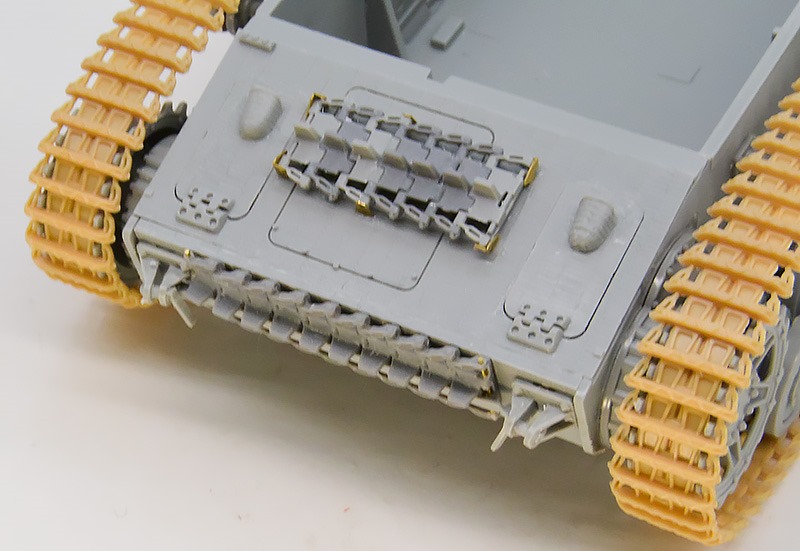 フロント天板に付いている予備履帯はキットのままでもラックがエッチングパーツで用意されており、さらに連結ピンがモールドされているパーツが特別に用意されているなど、なかなか意欲的なパーツ構成となっています。