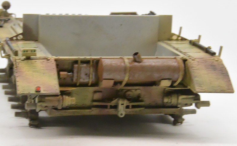 車体はまだバラバラになるのでバラして作業をします。タミヤのスミ入れ塗料のダークブラウンを塗って、乾いたら溶剤を染ませた筆で拭き取るのですが、ツィンメリットコーティングの部分は上手く拭き取れないので、ここは薄めて流すだけの方が良かったですね。