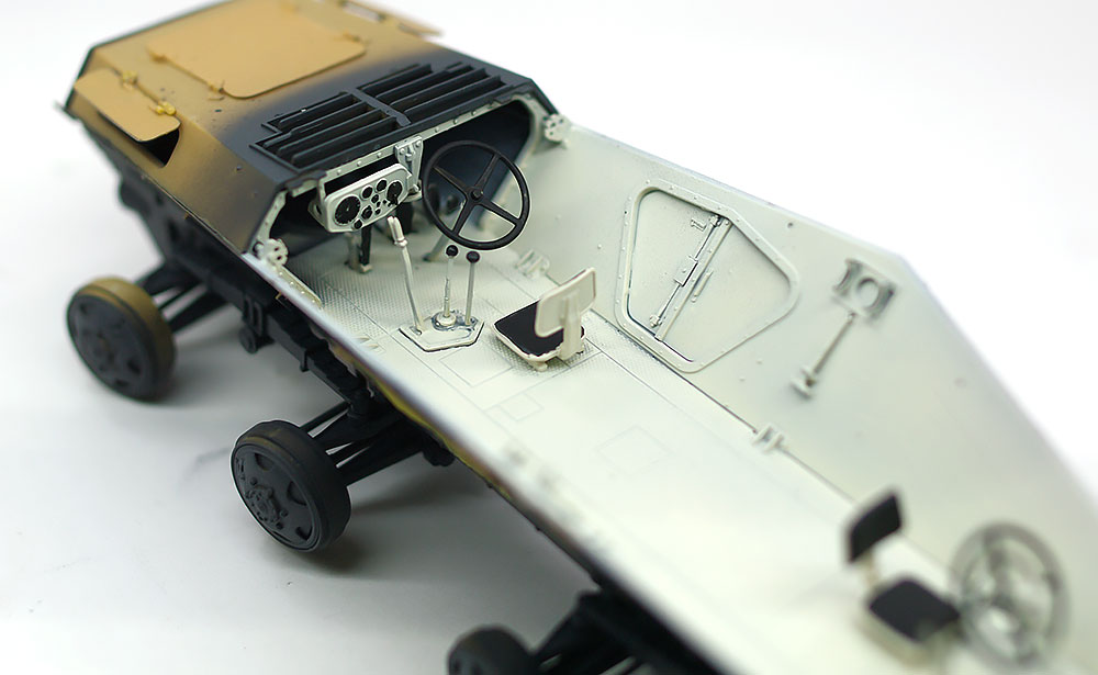 座席やレバーなど車内を組み立てます。複雑な機構を持った8輪重装甲車なので、レバーやペダルも普通の車よりもたくさんあります。