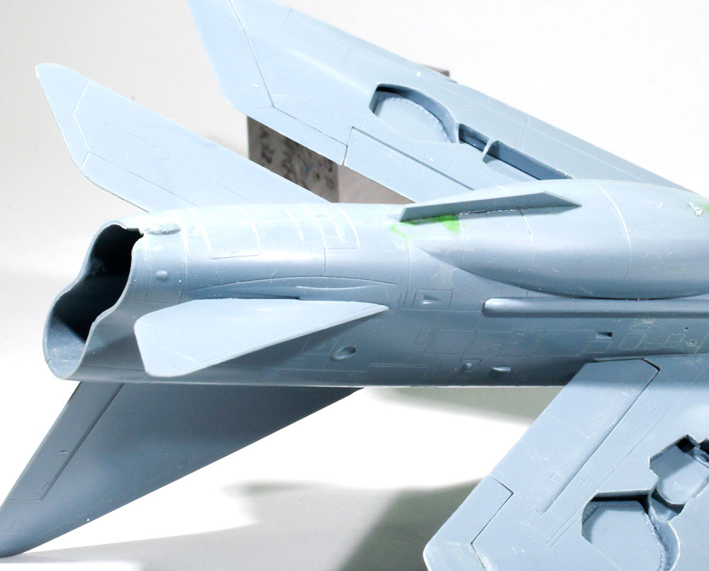 垂直尾翼を取り付けます。1パーツですからそのまま貼り付けるだけなんですが、丁度機体の背中のラインと繋がる部分に隙間ができるので、ここは丁寧にすりあわせて隙間ができないようにしました。