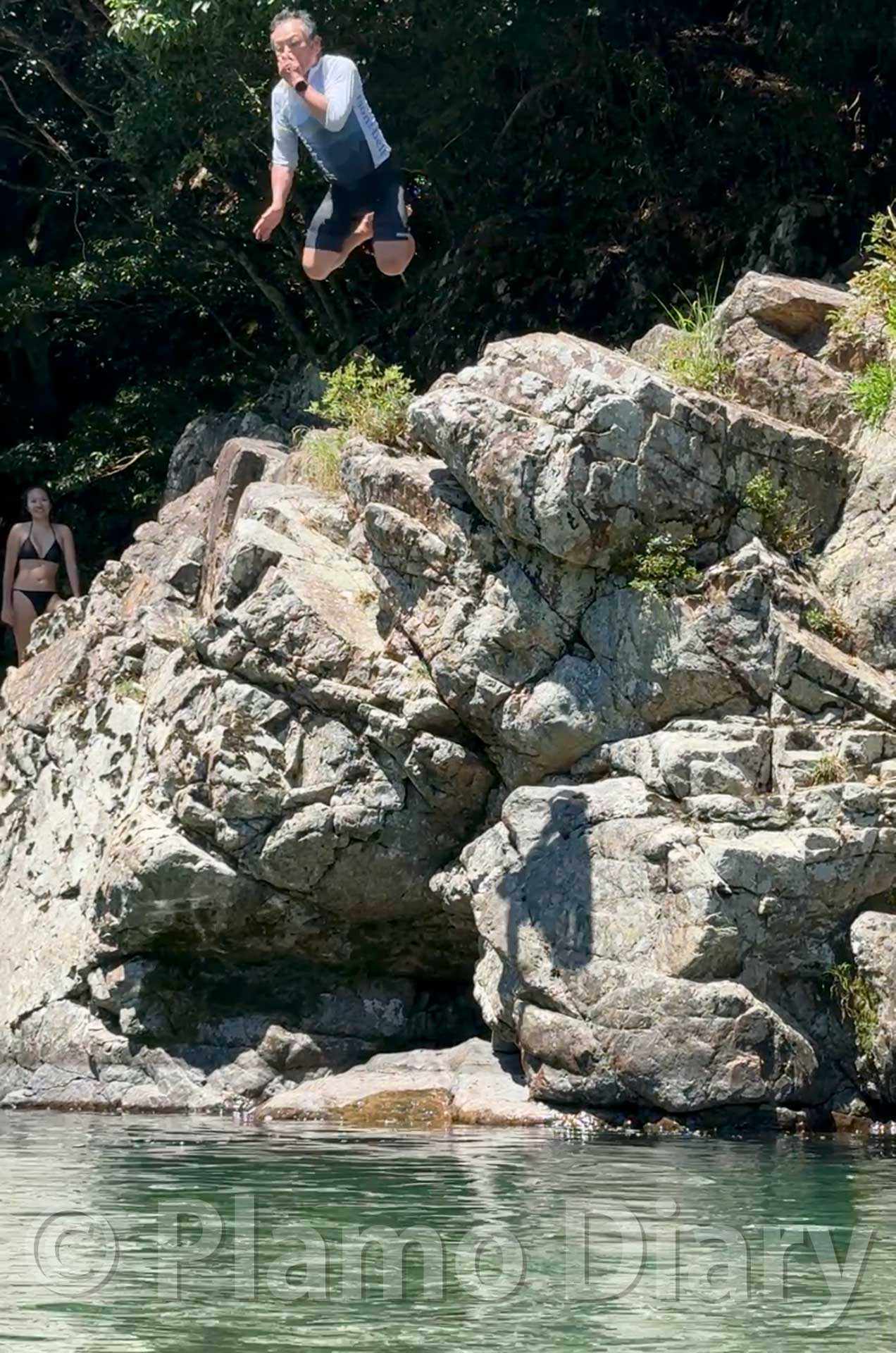 ここへ来たら必ずするのが、岩からのダイビングです。水深は3〜4mほどでしょうか、そこへ崖の上から飛び降ります。これが気持ちが良いのなんのって。
