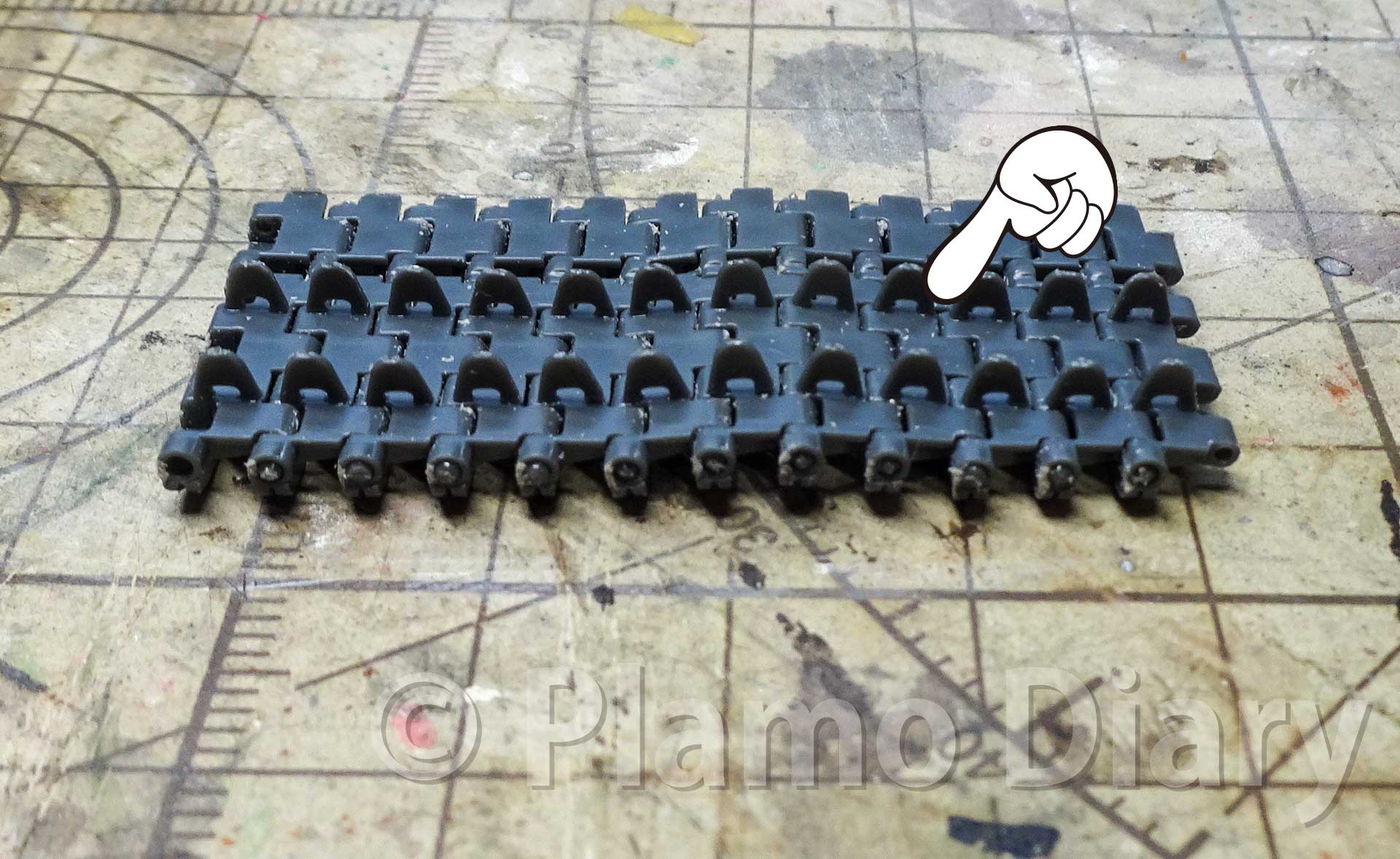 履帯のパーツはこんな風に12コマ1組で準備されています。ティーガー1の履帯は、左右ともに96コマですから、このランナーを左右で8組ずつ使います。この写真に写っているのが片側分です。