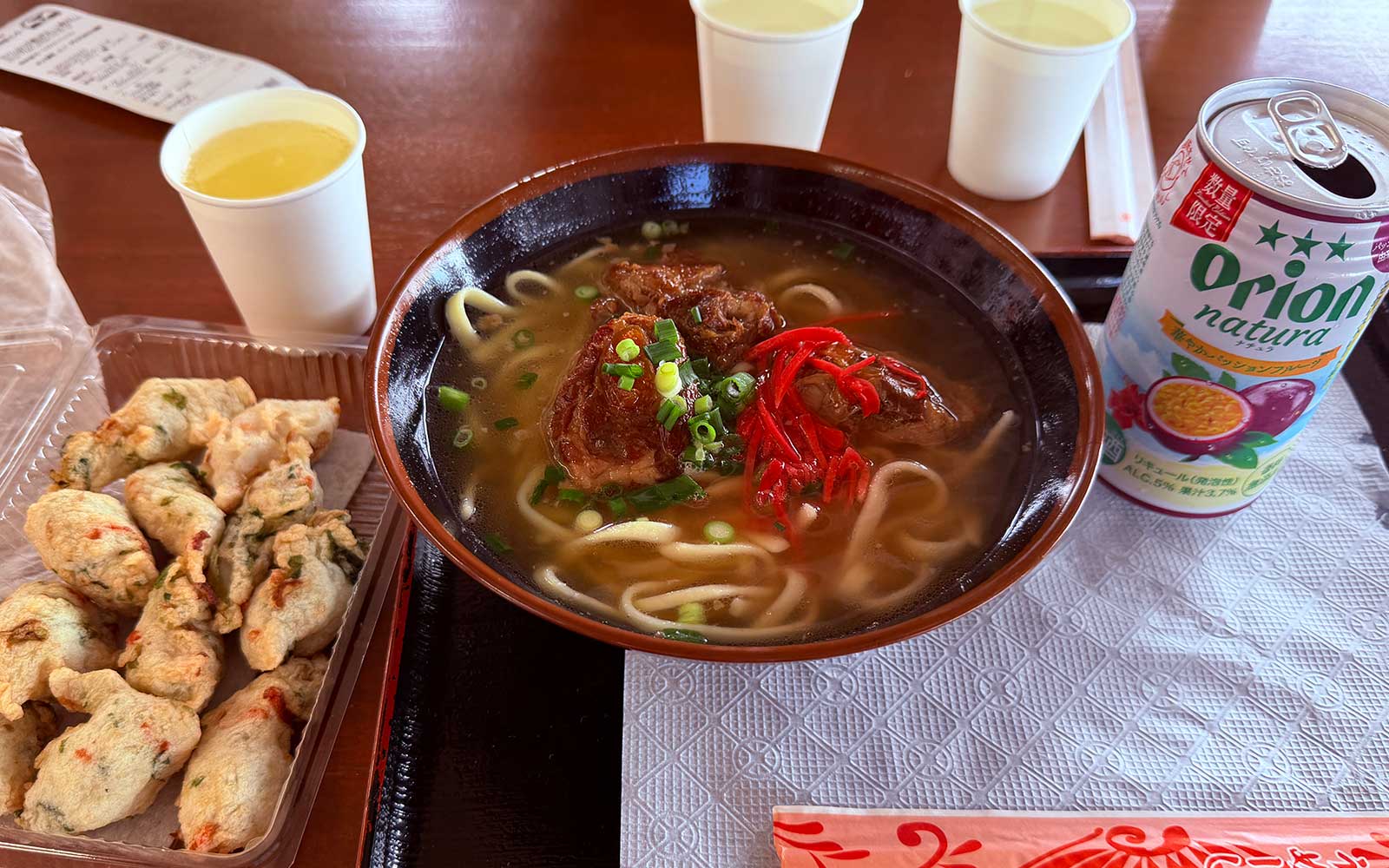レンタカーを借りてジャングリアのある北に向かって出発です。途中の道の駅でお昼ごはんにソーキそばをいただきました。スペアリブの角煮が美味しかったですね。運転は友達に任せていたので、オリオンのチューハイもちゃっかりいただきました。