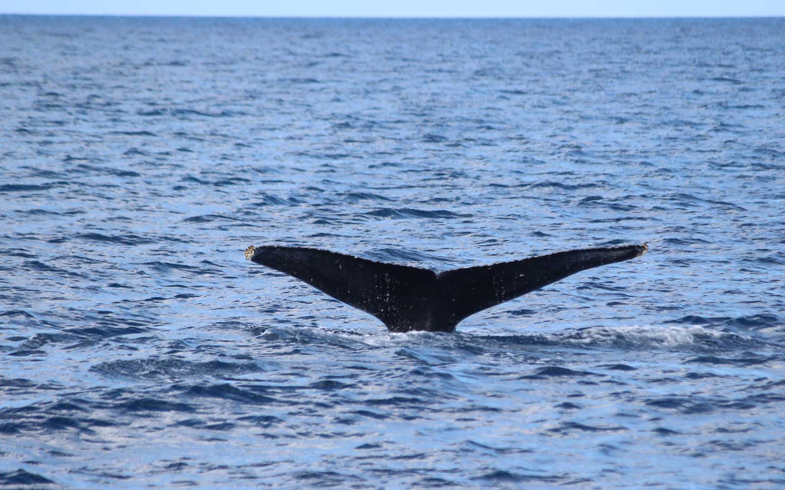 鯨の追跡時間は、鯨のストレス回避のため1時間に制限されています。その間に15分おきに、ブシューという息継ぎと同時に鯨が現れます。ただ今回の鯨君はシャイな性格なのか、派手なパフォーマンスは無く、しっぽや背中をチラリと見せるだけで潜っていきました。これを3回ほど見た後、港に向かいます。