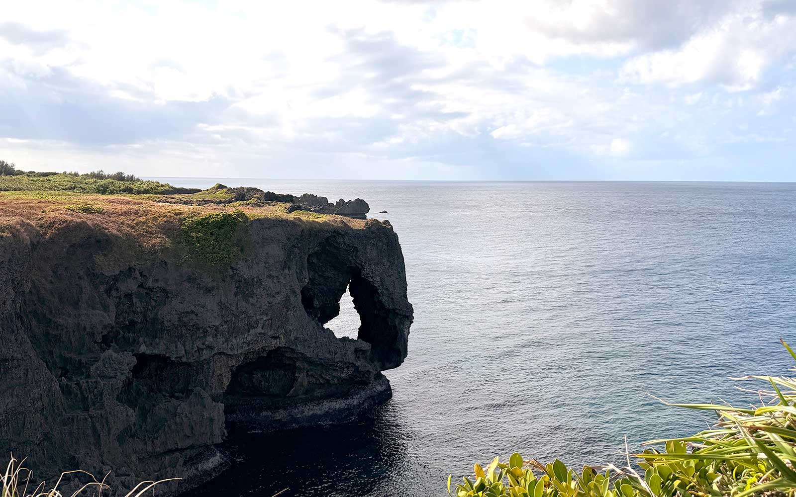 午後の目的地の万座毛です。「まんざもう」と読みます。波に浸食された石灰岩が作る景勝地で、崖の上の草原が、万人が座するに値する草原(毛)ということで、万座毛と名付けられているそうです。残念ながらその草原は、植生保護のために立入禁止で、周囲の散策路を歩くだけです。あの草の上に寝転がってみたかったですね。