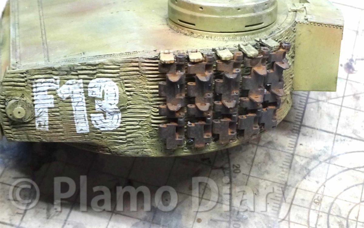 塗装も車体に巻いた履帯と一緒にすませてあるので、今回はウエザリングだけをします。車体に巻いた履帯は泥汚れでゴテゴテですが、予備履帯は錆を浮かせます。鋳物の履帯は無塗装なので、車体に取り付けられているうちにサビサビになります。錆色のピグメントを溶いて塗り、乾いたら硬めの筆でこすって余分の粉を落とします。