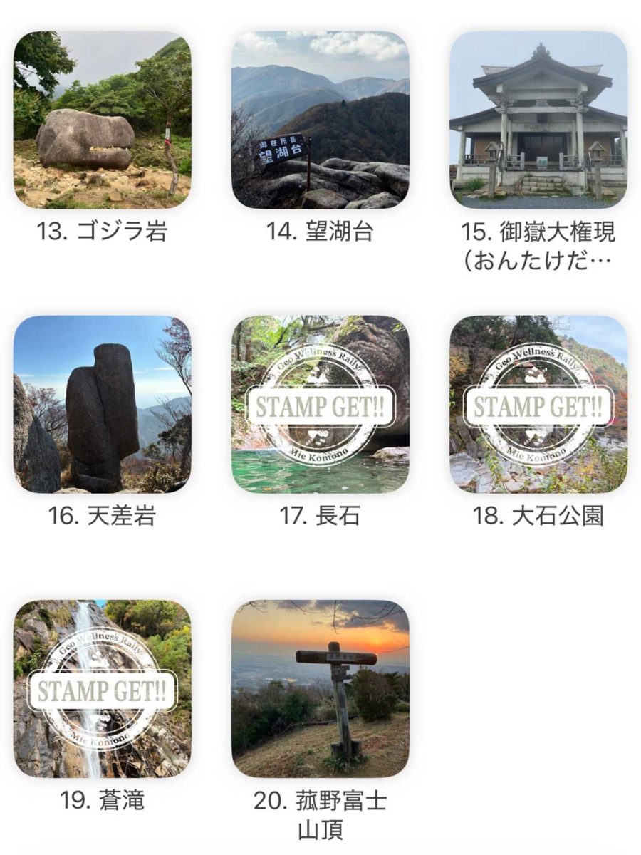 今月末まで菰野町で開催されているジオウエルネスラリーは、スマホのGPSを使って指定されたチェックポイントを巡るイベントです。いつでも好きなときに参加して、スタンプを貯めれば記念品がもらえるというものです。チェックポイントは御在所岳を中心に、麓から山頂、途中の登山道まで20箇所あります。今回はそのうちの3箇所ほどをちょいとかじることにしました。