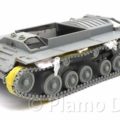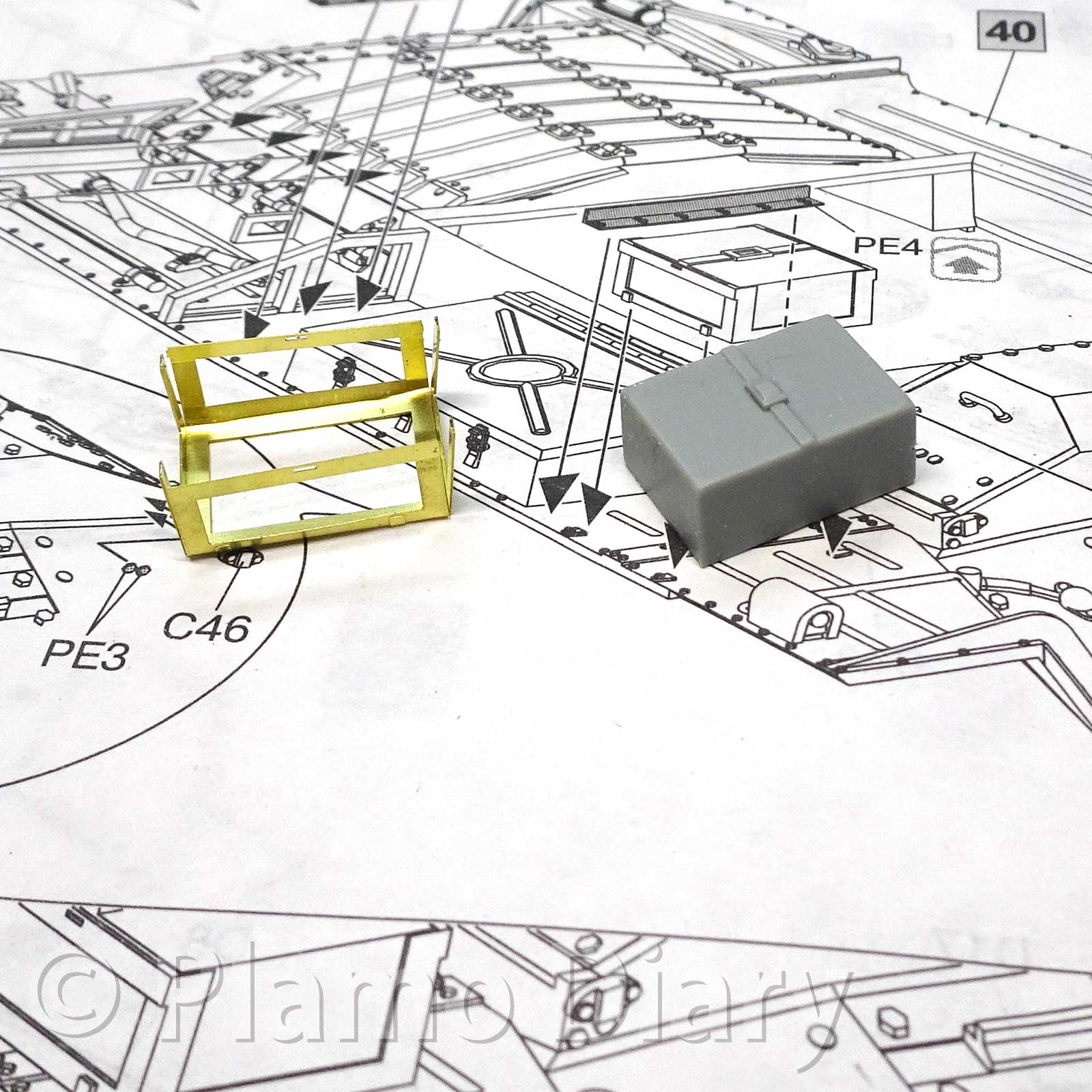 ジャッキ台の後には大きな箱が付きます。そしてその後には予備履帯が付きます。予備履帯は履帯パーツを連結してエッチングパーツの留め具で押さえるのですが、塗装の手間を考えて、置いているだけです。予備履帯には連結ピンの穴を開けてあります。見えるこちら側だけですけど(;^ω^)