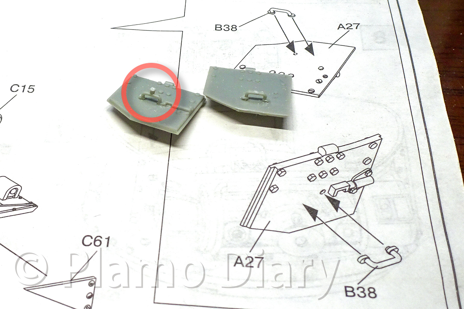 運転席のハッチを組み立てます。組み立てると行っても裏表に手すりを付けるだけです。完成後は開けた状態にしようと思っているので、裏側も作ります。手すりは非常に細かなパーツで、ゲートの処理をしようと思うと壊しそうです。そこでゲートを残したまま接着し、硬化後に処理します。