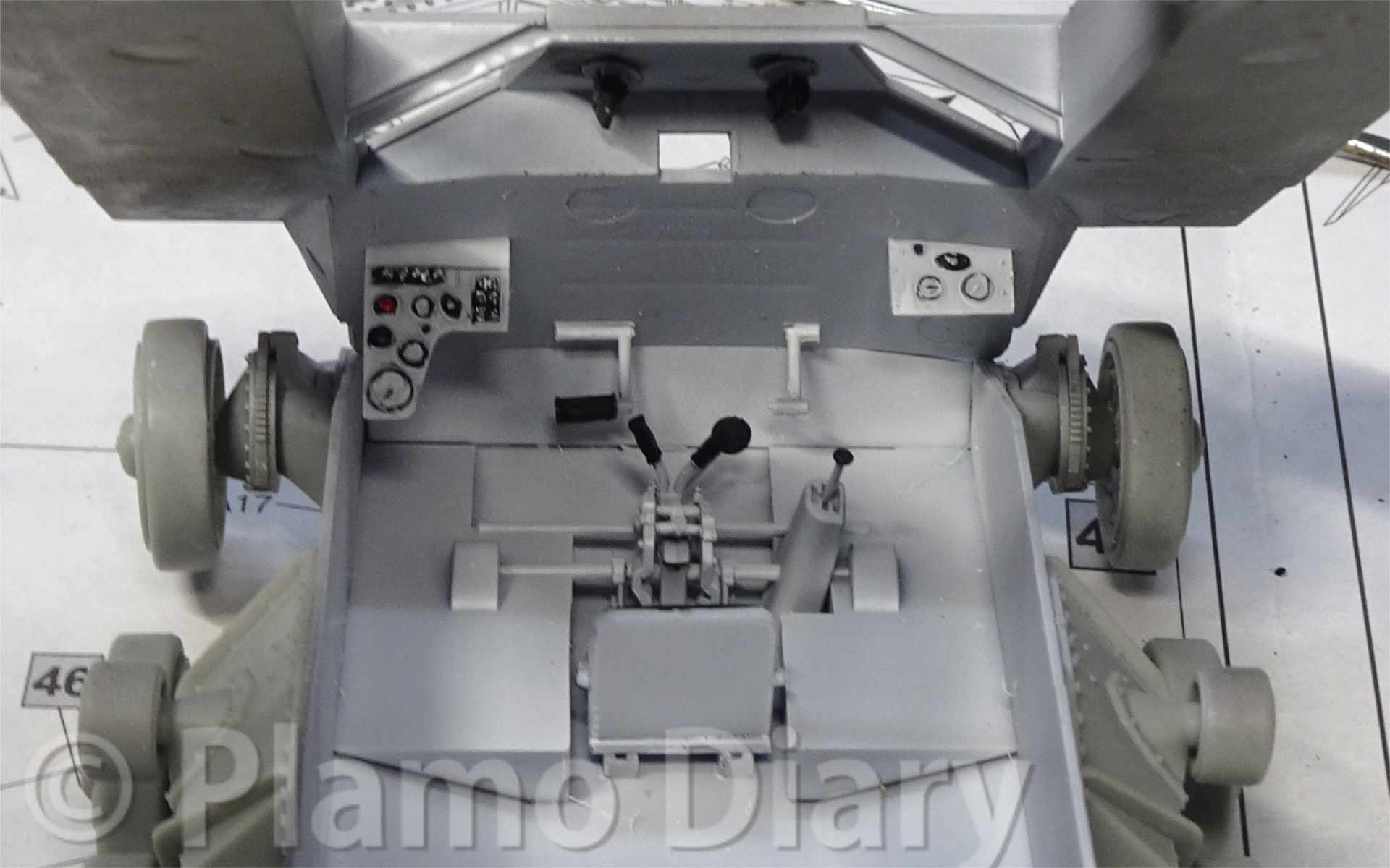 車体の上下が揃った運転席はこんな感じです。これは砲塔のあるあたりから覗いていますが、実際にはこれより前のハッチからですから、もっと見えないと思いますので、これくらいで十分かと思います。