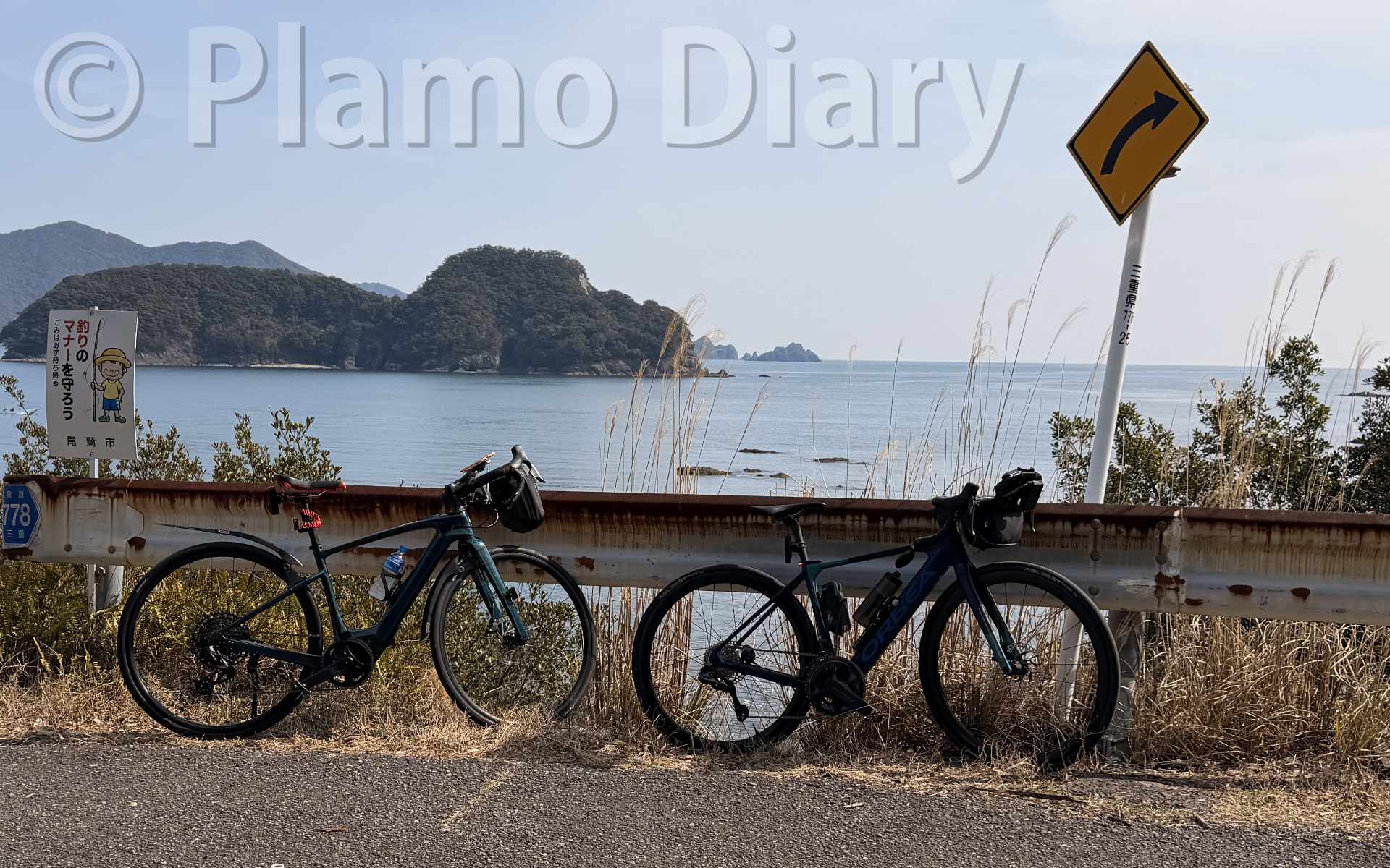 尾鷲港を越えてからは古い県道を走ります。こちらはくねくねと海岸近くを走るので、景色は抜群ですが、その代わりアップダウンが激しく相当ハードなコースです。こんな高いところまで上がったかと思うと、海岸近くまで降りるというのを繰り返します。特に九鬼のあたりは10〜12%の傾斜が続き、Eバイクとはいえ心臓はバクバクです。友人のEバイクはアシストが強いのですが、バッテリーの持ちが心配です。昨年長野の行った時はバッテリー切れで走れなくなったこともありました。あまりにキツイ坂が続くので、いつもは敬遠する4〜6%の傾斜がうれしいほどでした。