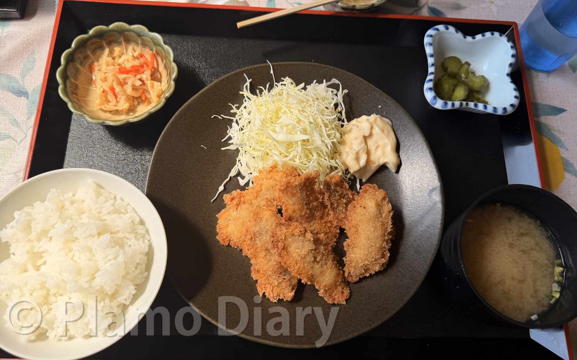 それでも64kmの距離を3時間チョイで走りきり、なんとか目的地の賀田駅周辺につきました。お昼ごはんを食べようとコンビニとかを探すのですが、なにもありません。これは不味いことになったと思ったら、小さな食堂を見つけました。そこにでのぼり旗が立っていた「本気の鰺フライ定食」を注文しました。のぼり旗を立てるだけはありますね。とても美味しかったです。