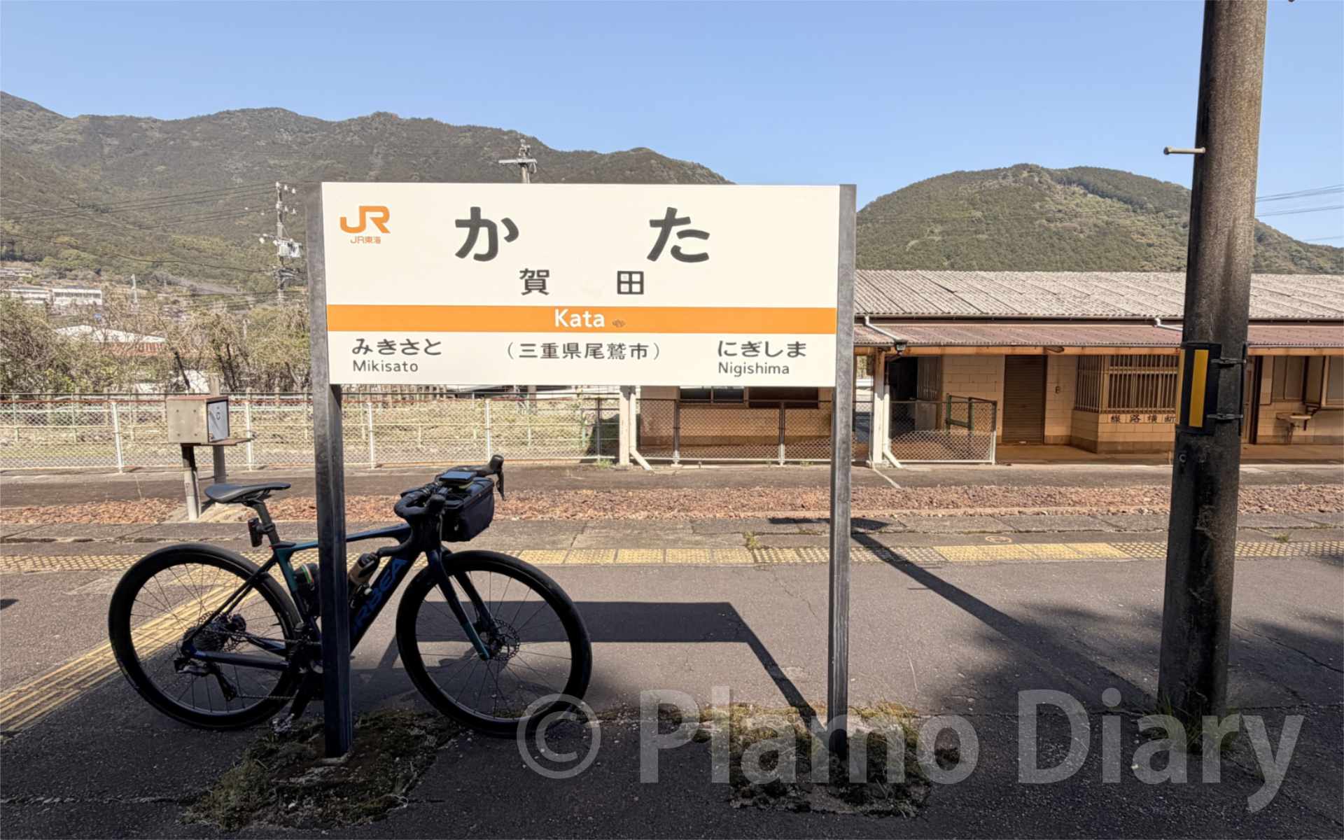 紀伊長島駅のホームは上り線が階段無しで外に出られるのに対し、下り線は跨線橋を越えないといけません。そこらへんもちゃんと調べてあったので、帰りは上りなので、階段不要のつもりでした。ところが乗ったのが、紀伊長島行きだったため、車輌は下り線に入りました。思っていたホームとは違うところで降ろされて目が点です。いくら軽量のロードバイクとはいえ、電池やモーターの付いたEバイクです。装備も含めて主さは12kgほどになります。これを抱えて階段を上り下りするのはまぁまぁ大変でした。友人のEバイクは15kgあるので、もっと大変でしょうね。
